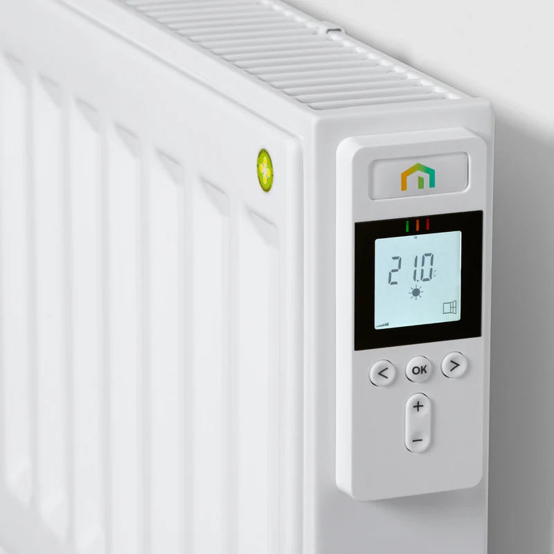 Let op: het bedieningspaneel zit plat op de zijkant van de radiator. Wil je deze net als op de afbeelding 90° kunnen draaien, dan raden we aan om de hoekadaptor te bestellen.